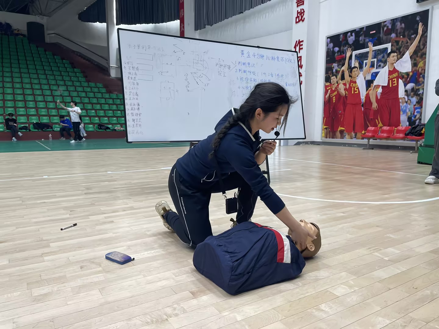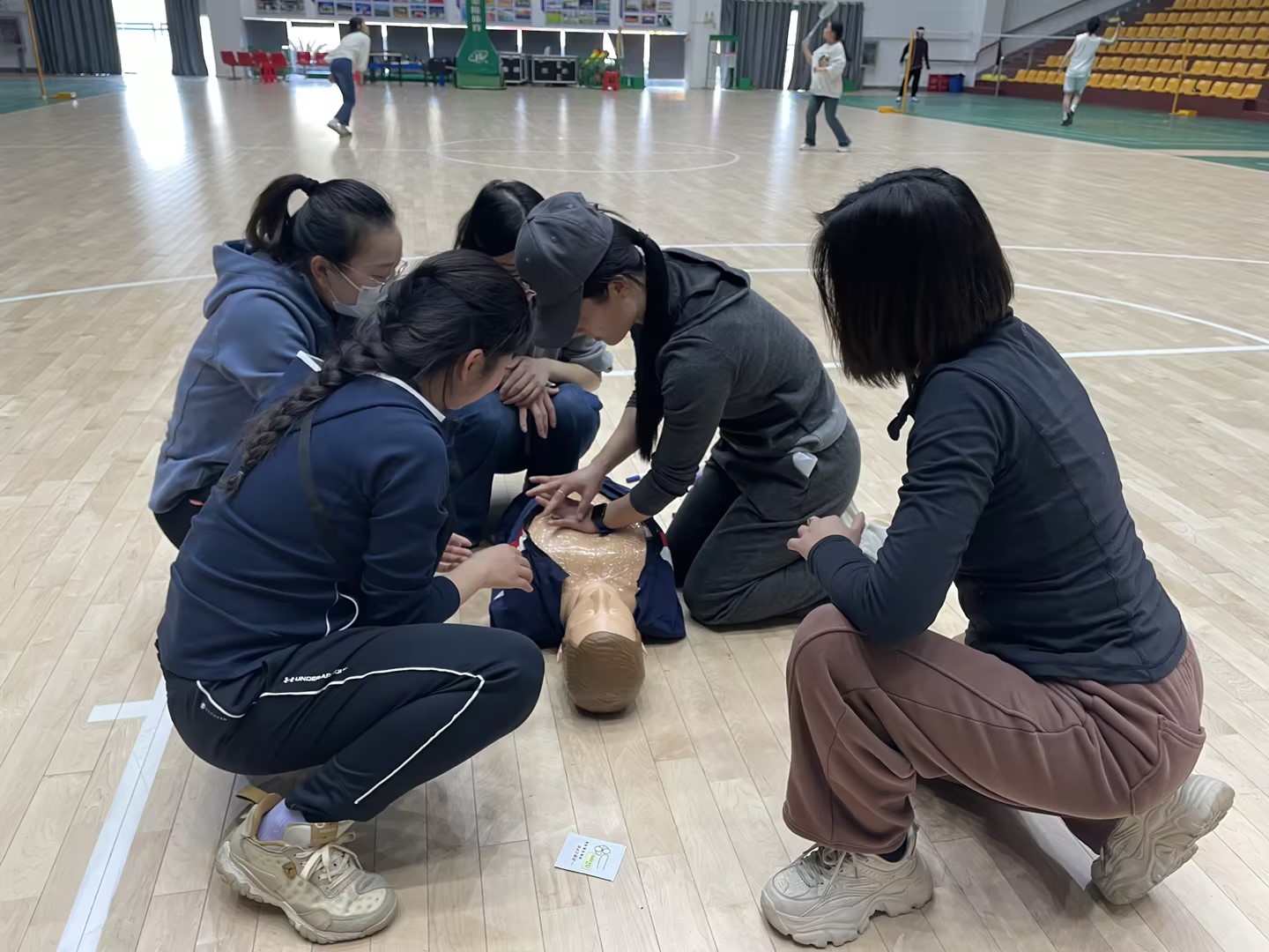 随后,由《运动损伤与急救》课程专职教师丁思琪带领大家进行运动损伤急救演练,丁思琪介绍了黄金4分钟心肺复苏的步骤,随后亲自示范专业急救动作和医疗器械的操作。讲解部分结束,教师们分成两组,分别练习徒手急救和使用医疗器械辅助急救。教师们在实操中,逐渐掌握了急救的方式方法,增强了同事之间的协同合作,提高了应急反应能力和现场处置能力。