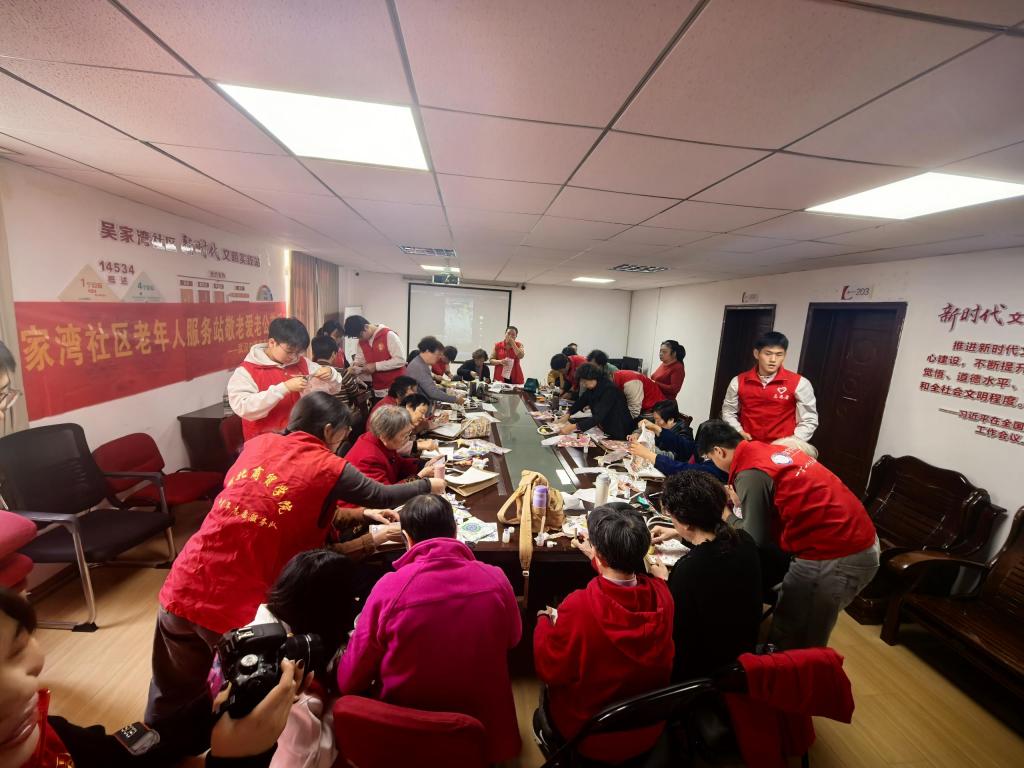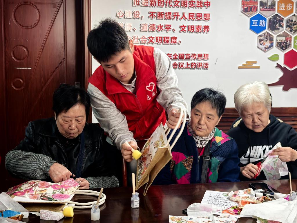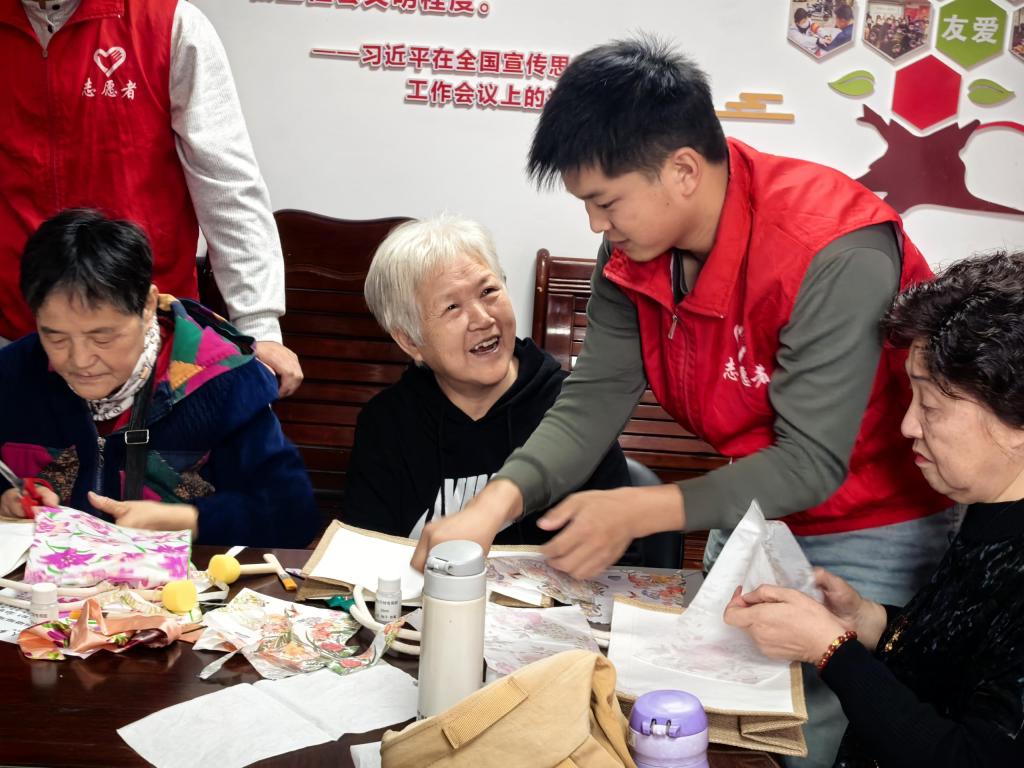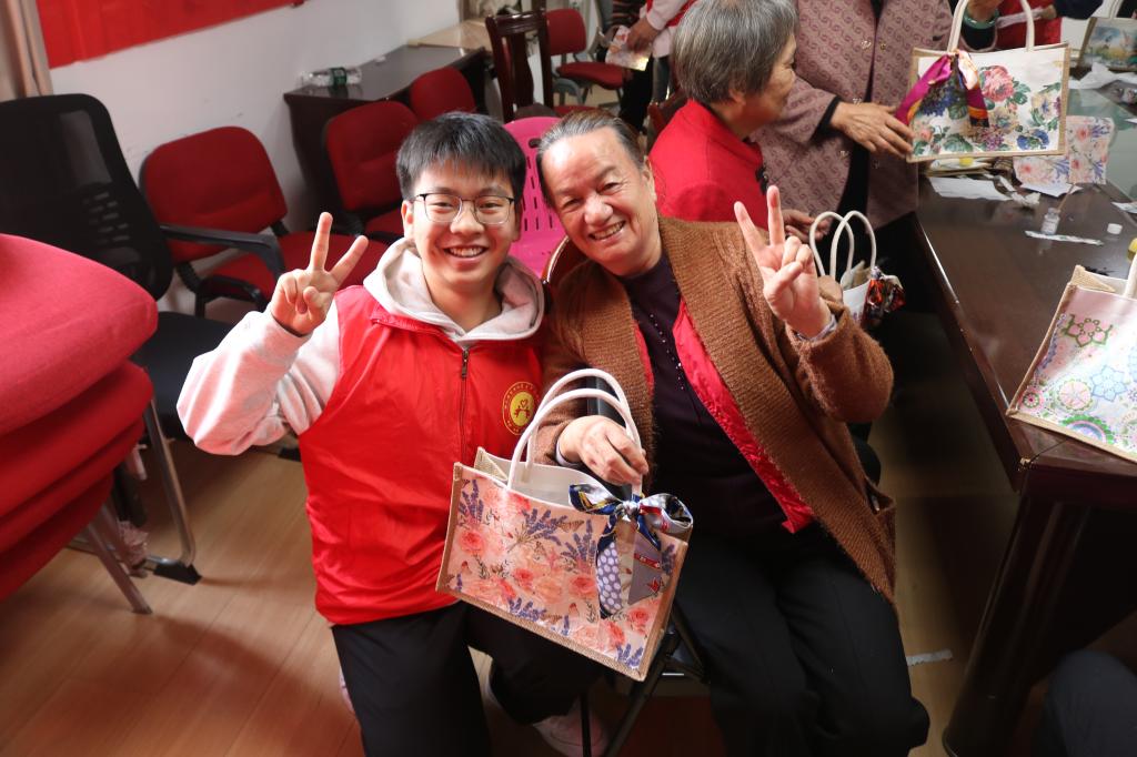 在互动环节,志愿者们与老人们结对参与手工包的制作活动。一双双稚嫩的手与布满岁月痕迹的手共同协作,描绘出一幅幅生动精巧的作品,也制作出了老少之间其乐融融的温情画面。志愿者们将制作好的满载吉祥寓意的手工包赠送给每一位老人。期间,退休老兵杨奶奶更是手拉着退伍大学生志愿者们的手,追忆起曾经在部队支援边疆的奋斗故事,把现场温馨氛围推向高潮。