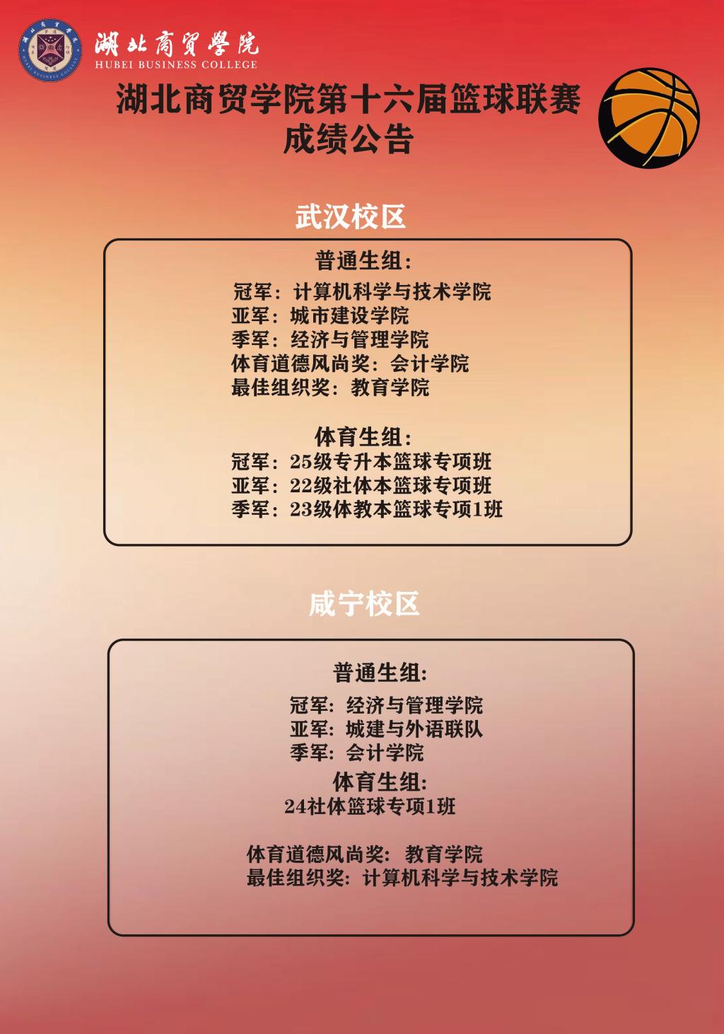 本届篮球联赛作为学校2025年体育文化节的重要组成部分,规模创历史之最。共有30支代表队、400余名运动员参赛,历时近一个月,经过50余场激烈角逐,最终计算机科学与技术学院、城市建设学院、经济与管理学院荣获武汉校区甲组前三名;25级专升本篮球专项班、22级社体本篮球专项班、23级体教本篮球专项1班获得乙组前三名。咸宁校区方面,经济与管理学院、城市建设学院与外国语学院联队、会计学院夺得甲组前三名。会计学院、教育学院分获武汉校区体育道德风尚奖和最佳组织奖;教育学院、计算机科学与技术学院分获咸宁校区相应奖项。